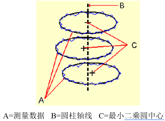 ‘最小二乘參考圓柱’是通過對選定參與軸線計算的每個被測圓的最小二乘圓的圓心來計算的。