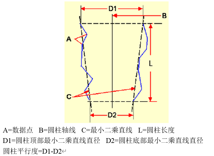以使用者選定的方位通過圓柱軸線建立一個縱切面。用圓柱軸線一邊所有點建立最小二乘直線,同樣,用圓柱軸線另一邊所有點建立第二條最小二乘直線。在該方位圓柱平行度是最高測量平面和最低測量平面處兩最小二乘直線間隔的差值。