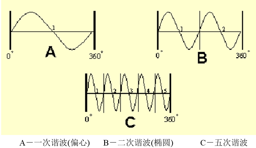 在圓形輪廓上諧波可以考慮為統(tǒng)一的波(正弦波)疊加在工件表面上。事實上,任意圓度圖形可由一系列正弦波疊加組成,舉列如下: