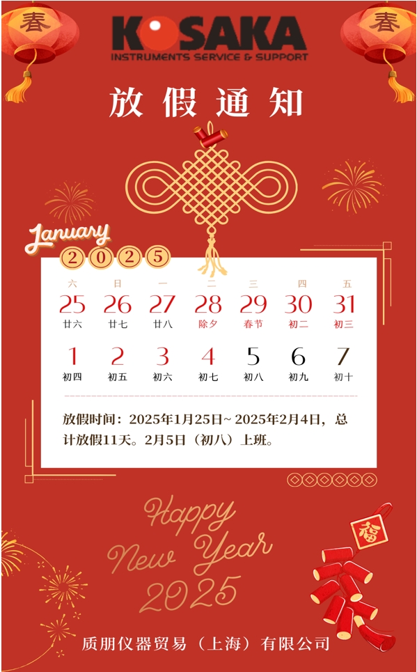 感謝大家一直以來對(duì)質(zhì)朋儀器貿(mào)易(上海)有限公司的信任與支持。農(nóng)歷蛇年新春來臨之際,公司依據(jù)國(guó)家放假通知精神,結(jié)合公司實(shí)際情況,安排春節(jié)假期如下,敬請(qǐng)知悉!