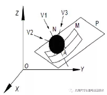 在三坐標(biāo)測(cè)試技術(shù)中,補(bǔ)償測(cè)針半徑是關(guān)鍵技術(shù),精密測(cè)量任何幾何元素,都必須作測(cè)針半徑補(bǔ)償,實(shí)際上,測(cè)量機(jī)的動(dòng)態(tài)顯示為測(cè)球中心位置,測(cè)量中測(cè)針必須沿著所測(cè)量點(diǎn)的法線無(wú)障礙地趨近測(cè)量點(diǎn)測(cè)量,并在該法線矢量上做測(cè)針半徑補(bǔ)償,如圖1述: