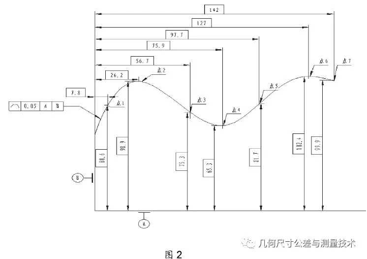 由圖2,我們采用傳統(tǒng)的檢測(cè)方法都是不行的,從圖形分析來(lái)看,有基準(zhǔn)要求,根據(jù)曲線上的點(diǎn)坐標(biāo)來(lái)判斷整段曲線的輪廓度誤差是否符合設(shè)計(jì)要求。在這里我們只能借助三坐標(biāo)測(cè)量機(jī)進(jìn)行自動(dòng)測(cè)量,那么我們需不需要導(dǎo)入數(shù)模呢?不需要。首先我們建立坐標(biāo)系,以基準(zhǔn)A 和B 為基準(zhǔn),坐標(biāo)建立以后,我們利用自動(dòng)測(cè)量點(diǎn),使用自動(dòng)測(cè)量的優(yōu)點(diǎn)是,省去了計(jì)算測(cè)頭接觸曲面的矢量角。測(cè)得的實(shí)際坐標(biāo)可以直接參與計(jì)算了。點(diǎn)1~點(diǎn)7 的X 軸實(shí)際坐標(biāo)為X1~X7,Y 軸實(shí)際坐標(biāo)為Y1~Y7,Z 軸坐標(biāo)值不考慮。