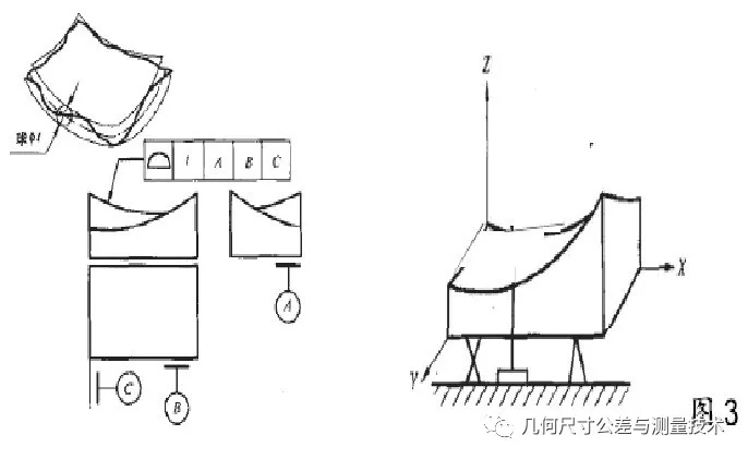 首先,我們分析圖1,這是我們做檢測(cè)的第一步,面輪廓度要求0.02mm,整個(gè)曲面是球面,根據(jù)要求,我們需要選擇合適的測(cè)量方法和測(cè)量器具,針對(duì)本例,很顯然不能用輪廓度樣板,使用輪廓度樣板法,普通塞尺的精度達(dá)不到,通常塞尺的最小測(cè)量精度0.02mm(量具的最小分辨率)≥1/3×0.02mm(被測(cè)要素的輪廓度公差值)。同樣用投影儀測(cè)量也是不合適的,圖1 零部件尺寸大且非薄壁件。那么我們用仿形測(cè)量裝置法進(jìn)行測(cè)量,配備輪廓度樣板、千分表、固定和可調(diào)支承,調(diào)整被測(cè)零件相對(duì)于仿形裝置和輪廓樣板的位置,千分表調(diào)零。仿形測(cè)頭在輪廓樣板上緩慢移動(dòng)至整段曲面,為了減小測(cè)量系統(tǒng)誤差,我們盡量使指示計(jì)測(cè)頭與仿形測(cè)頭的形狀一致,且垂直于理想輪廓方向上,由千分表讀取示值并做好記錄,記錄的點(diǎn)數(shù)應(yīng)不少于10 點(diǎn),取其最大示值的2 倍,即為面輪廓度誤差值f。值得注意的是:整個(gè)曲面是球體,為了能夠覆蓋到整個(gè)曲面,我們需要每隔120°測(cè)量一組數(shù)據(jù)。假設(shè)我們測(cè)量的數(shù)值: