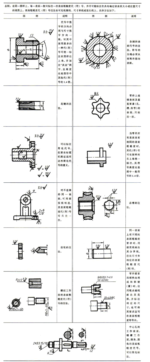 表面粗糙度參數(shù)值的選用,應(yīng)該既要滿足零件表面的功能要求,又要考慮經(jīng)濟(jì)合理性。具體選用時(shí),可參照已有的類似零件圖,用類比法確定。在滿足零件功能要求前提下,應(yīng)盡量選用較大的表面粗糙度參數(shù)值,以降低加工成本。一般地說(shuō),零件的工作表面、配合表面、密封表面、運(yùn)動(dòng)速度高和單位壓力大的摩擦表面等 ,對(duì)表面平整光滑程度要求高,參數(shù)值應(yīng)取小些。非工作表面、非配合表面、尺寸精度低的表面,參數(shù)值應(yīng)參數(shù)Ra值與加工方法的關(guān)系及其應(yīng)用實(shí)例,可供選用時(shí)參考。