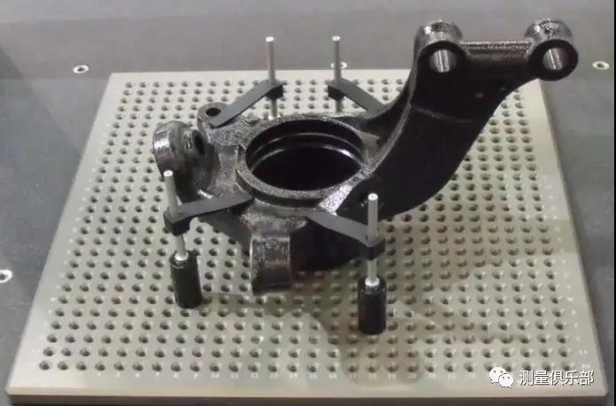 通過安裝測(cè)量支架,可將被測(cè)零件正確定位和固定在測(cè)量系統(tǒng)內(nèi),從而降低操作人員的測(cè)量難度,利于測(cè)量及其分析。零件安裝在測(cè)量支架上后,要保證零件所有的孔、面和切邊是可測(cè)的,為保證在測(cè)量過程中不與測(cè)量機(jī)發(fā)生碰撞,必須有足夠的邊緣間隙,同時(shí)要符合人機(jī)工程學(xué)。測(cè)量支架的結(jié)構(gòu)材料一般為特殊的鋁合金,表面要進(jìn)行黑色陽(yáng)極氧化處理。