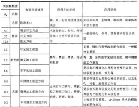 關(guān)于表面粗糙度的數(shù)值和表面特征、獲得方法、應(yīng)用舉例請參見下表